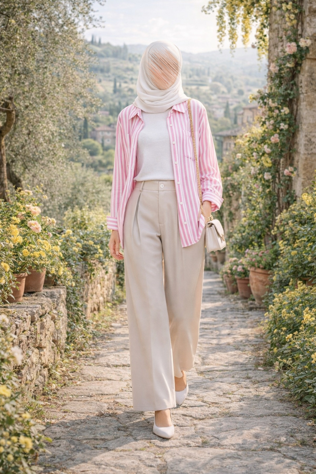 The set consists of stylish straight-cut trousers, a soft inner top, a lightweight striped shirt, with a matching belt that defines the waist and completes the look in an elegant style.