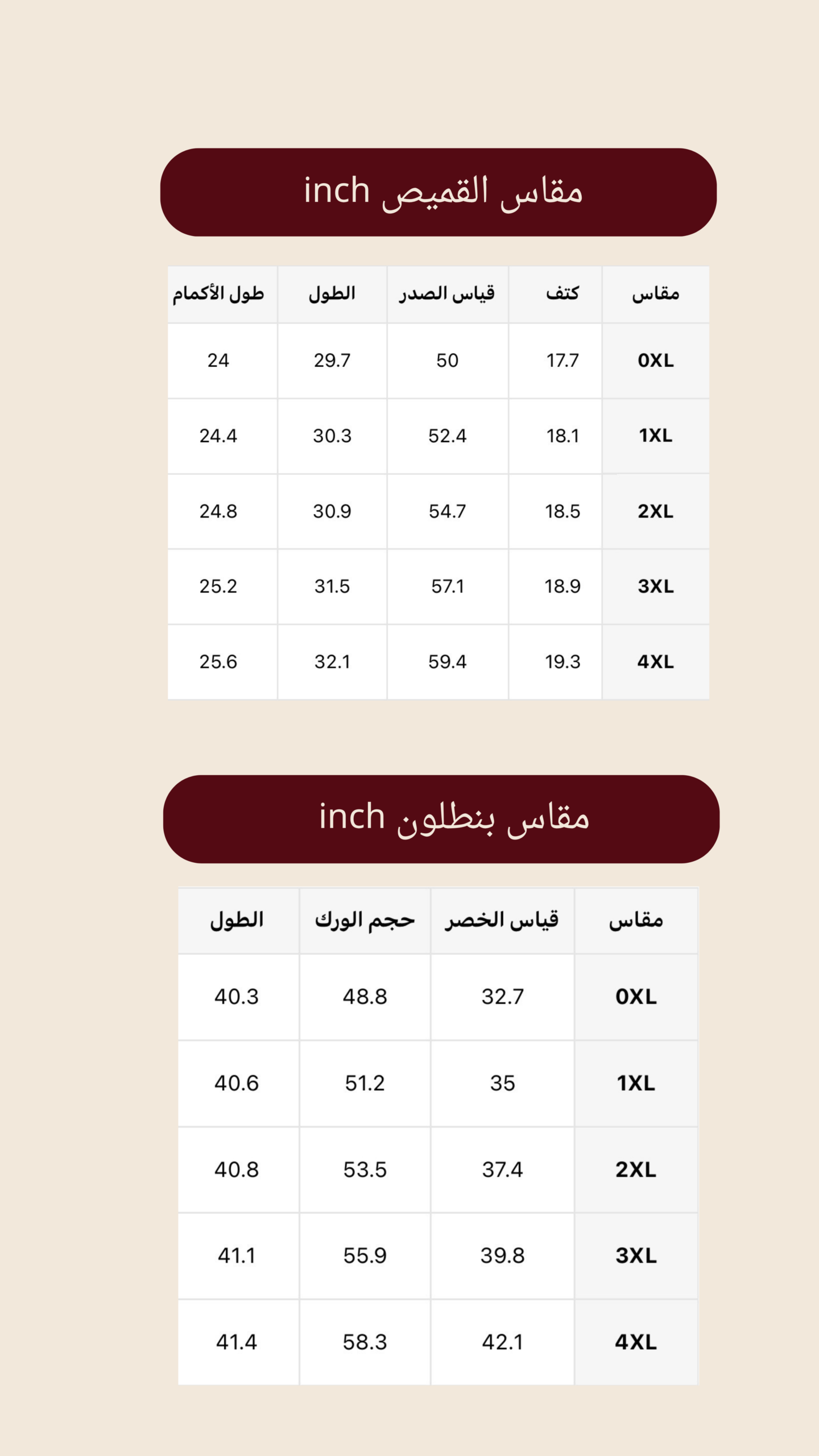| مقاس بنطلون ( pant size) : | 0XL, 1XL, 2XL, 3XL, 4XL |