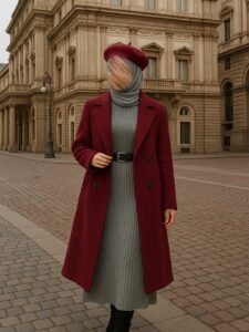 Featuring a long burgundy coat, a grey knit midi dress, and a belt that defines the waist with a refined, balanced touch.