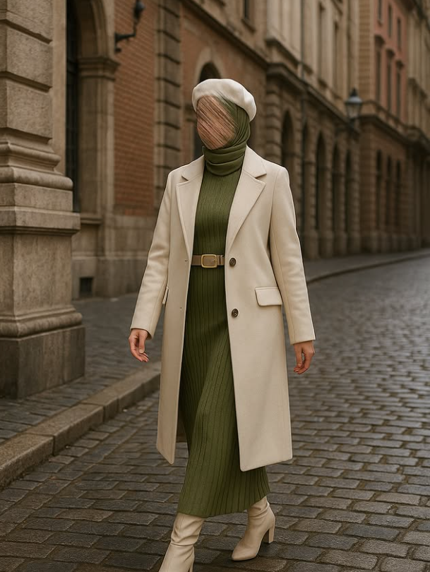 The set includes a long beige jacket, an olive knit winter dress, a waist-defining belt, and a classic beret to complete the look.