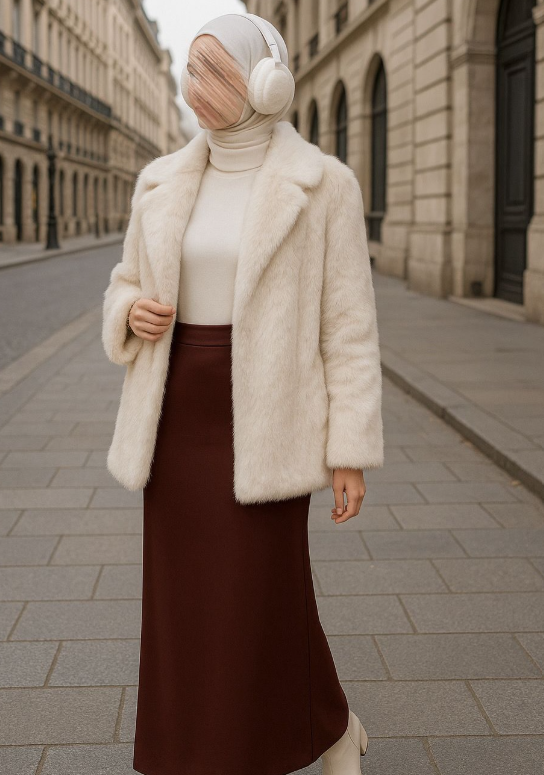 يتكوّن من جاكيت فرو أنيق، تنورة ساتان بلون برغندي غني، قميص داخلي راقٍ، وسماعة رأس شتوية تكمل الإطلالة بلمسة فخمة ومتوازنة.