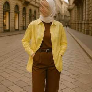 يتكوّن الطقم من بنطلون أنيق بقصّة مستقيمة، توب داخلي ناعم، قميص مخطط خفيف، مع حزام متناسق يحدد الخصر ويكمل الإطلالة بأسلوب راقٍ.