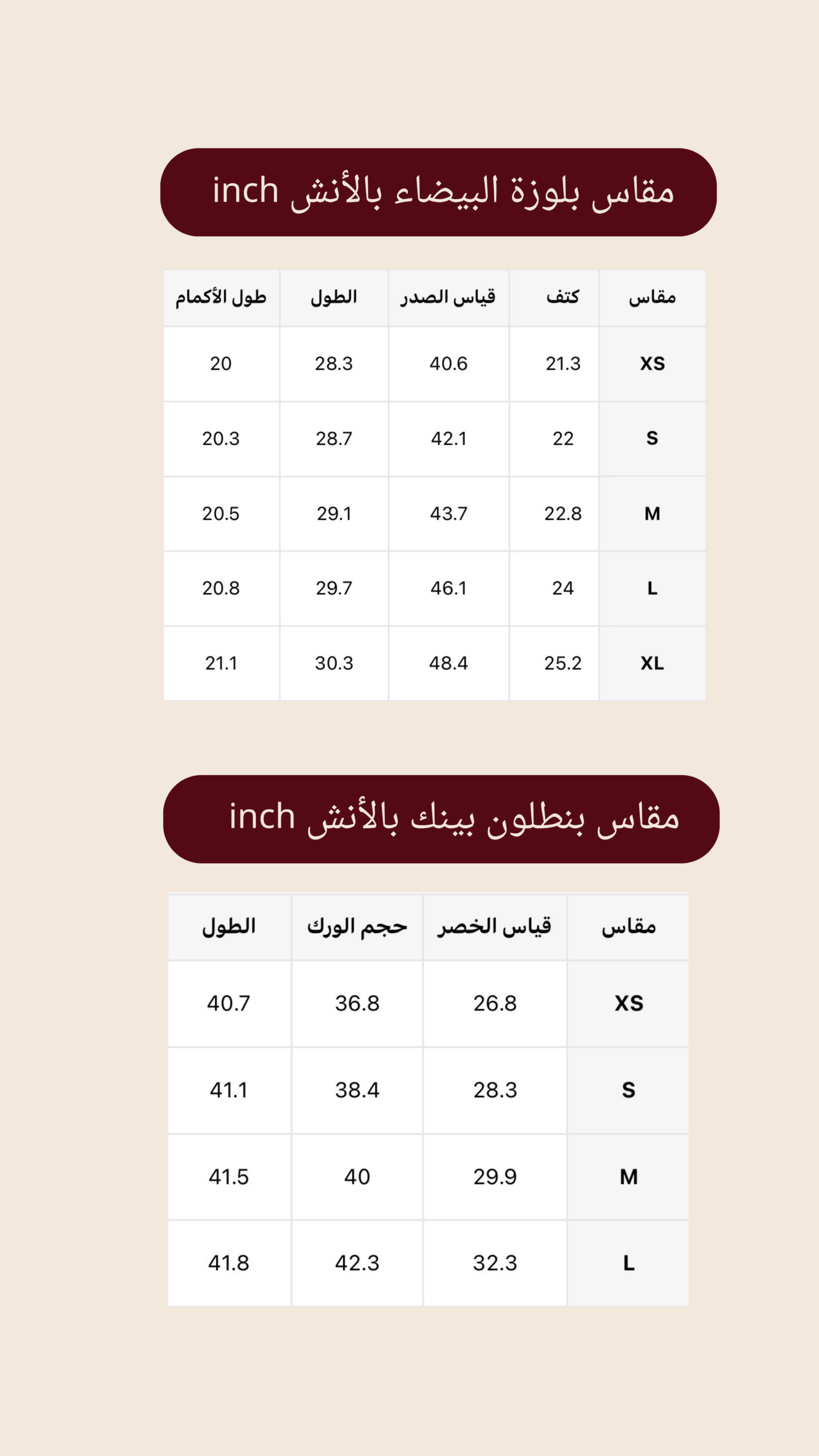 | المقاس بنطلون (size pant) | S, M, L, XL |