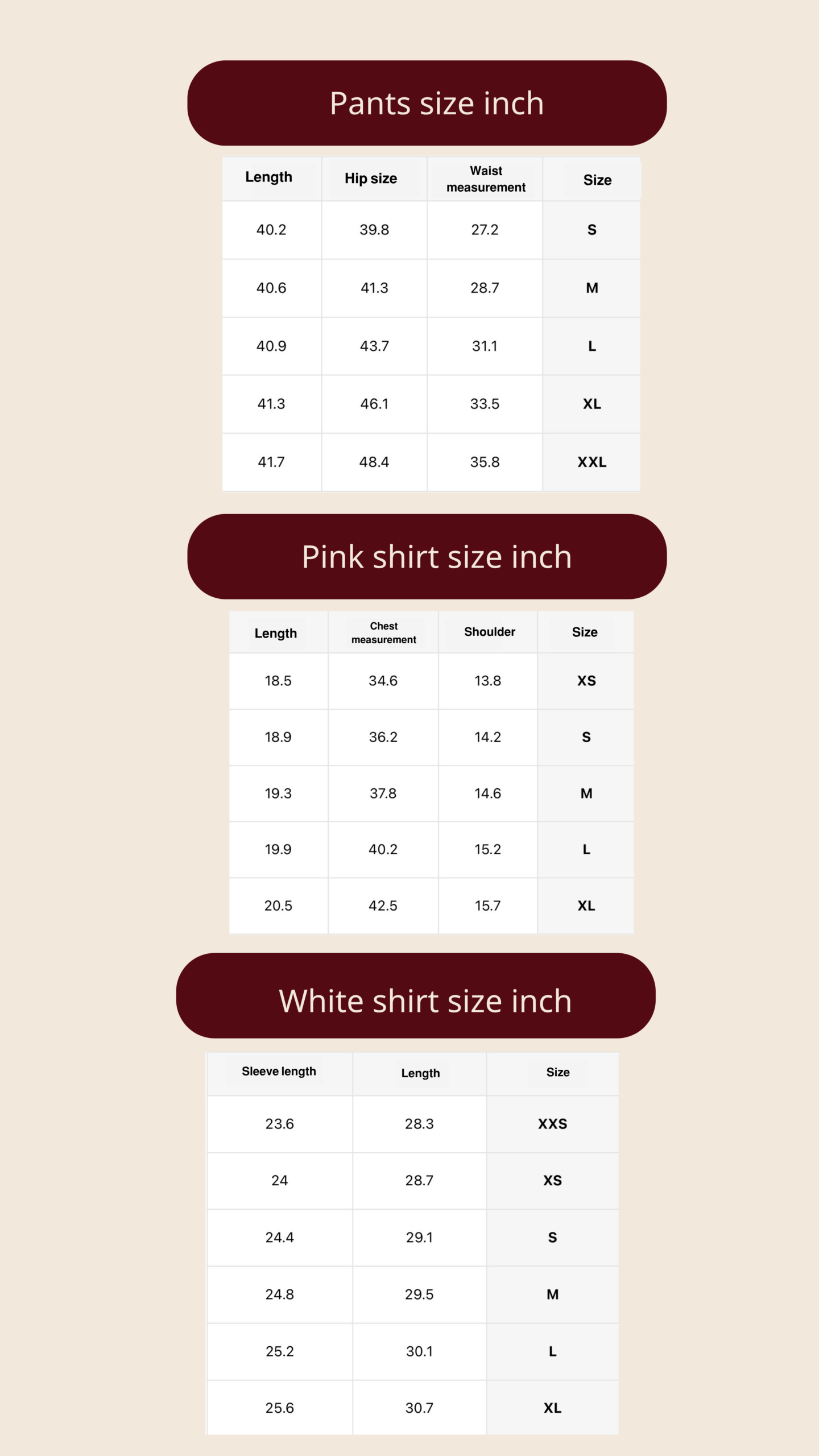 | مقاس قميص وردي (Pink shirt size) | S, M, L, XL |