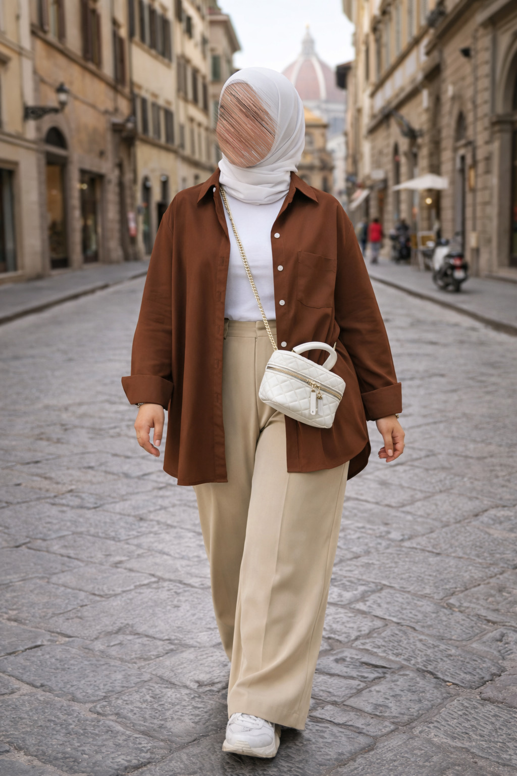 طقم أنيق يتكوّن من قميص بني دافئ مع توب داخلي وبنطلون بلون بيج بقصة واسعة ومريحة.