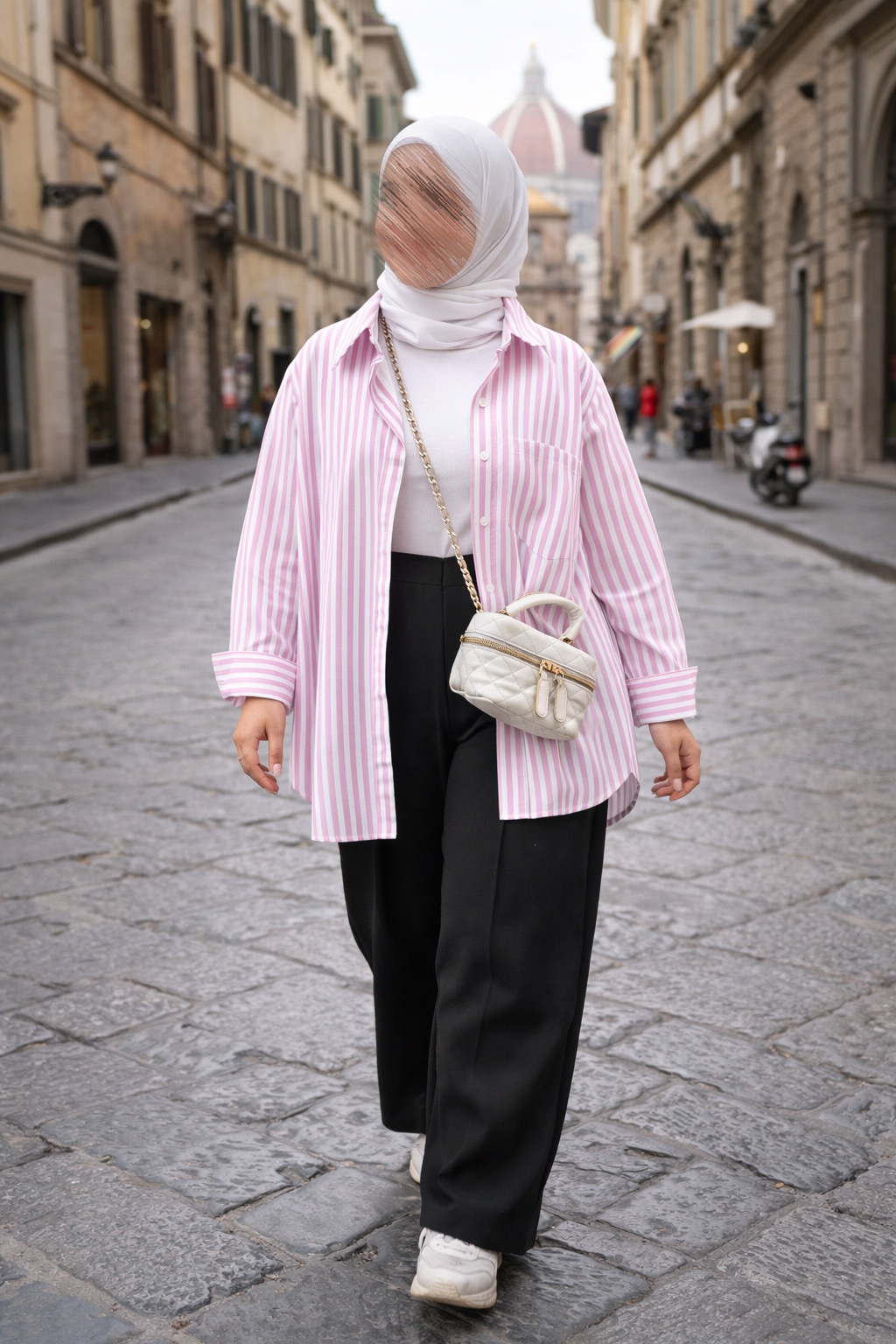 طقم صيفي منعش يتكوّن من قميص مخطط باللون الوردي مع توب داخلي وبنطلون واسع بقصة مريحة.إطلالة حيوية تجمع بين النعومة والانتعاش، مثالية لإطلالات السفر الصيفية المميزة.