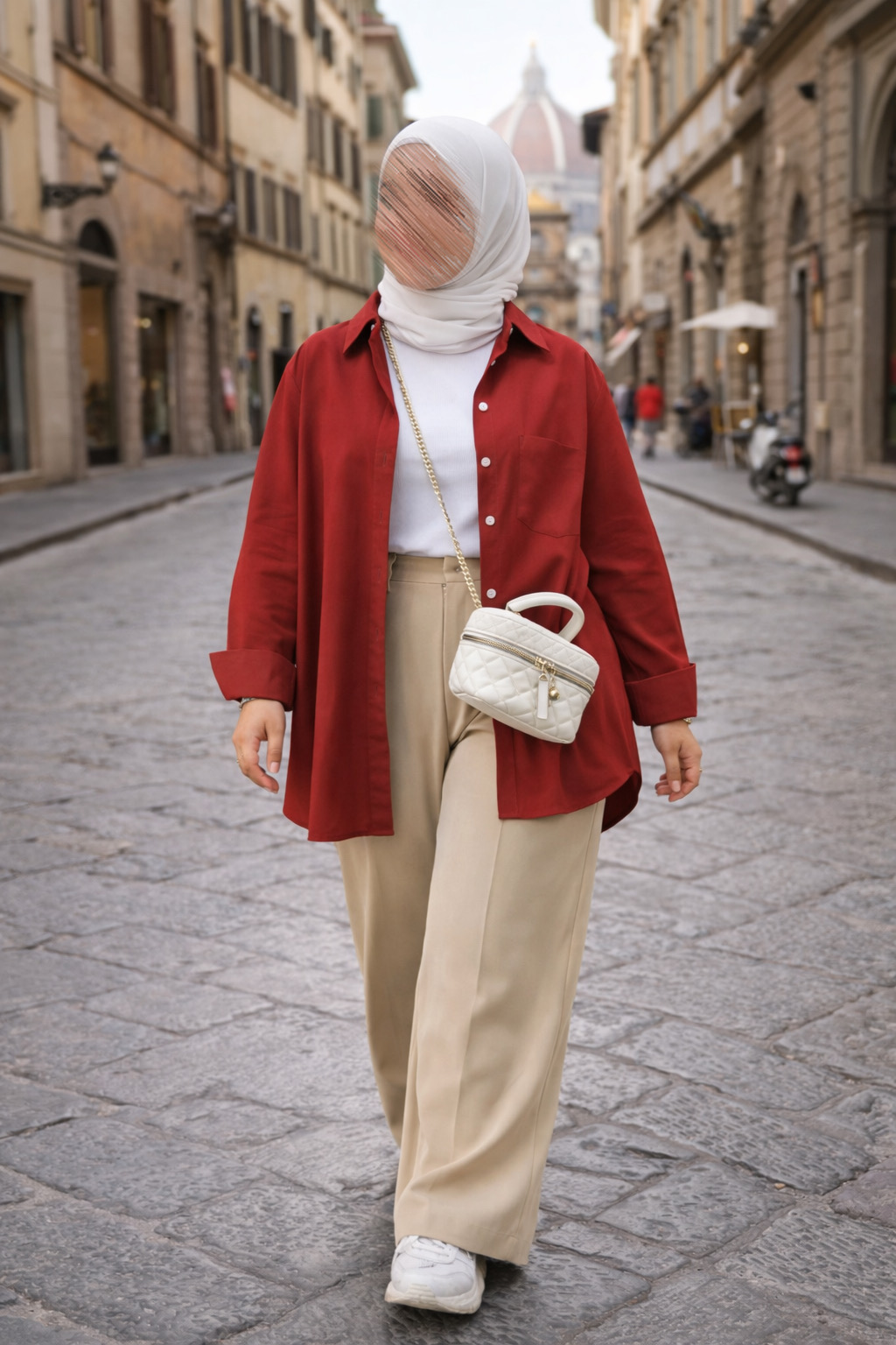 طقم أنيق يتكوّن من قميص أحمر غني مع توب داخلي وبنطلون بلون بيج بقصة واسعة ومريحة.