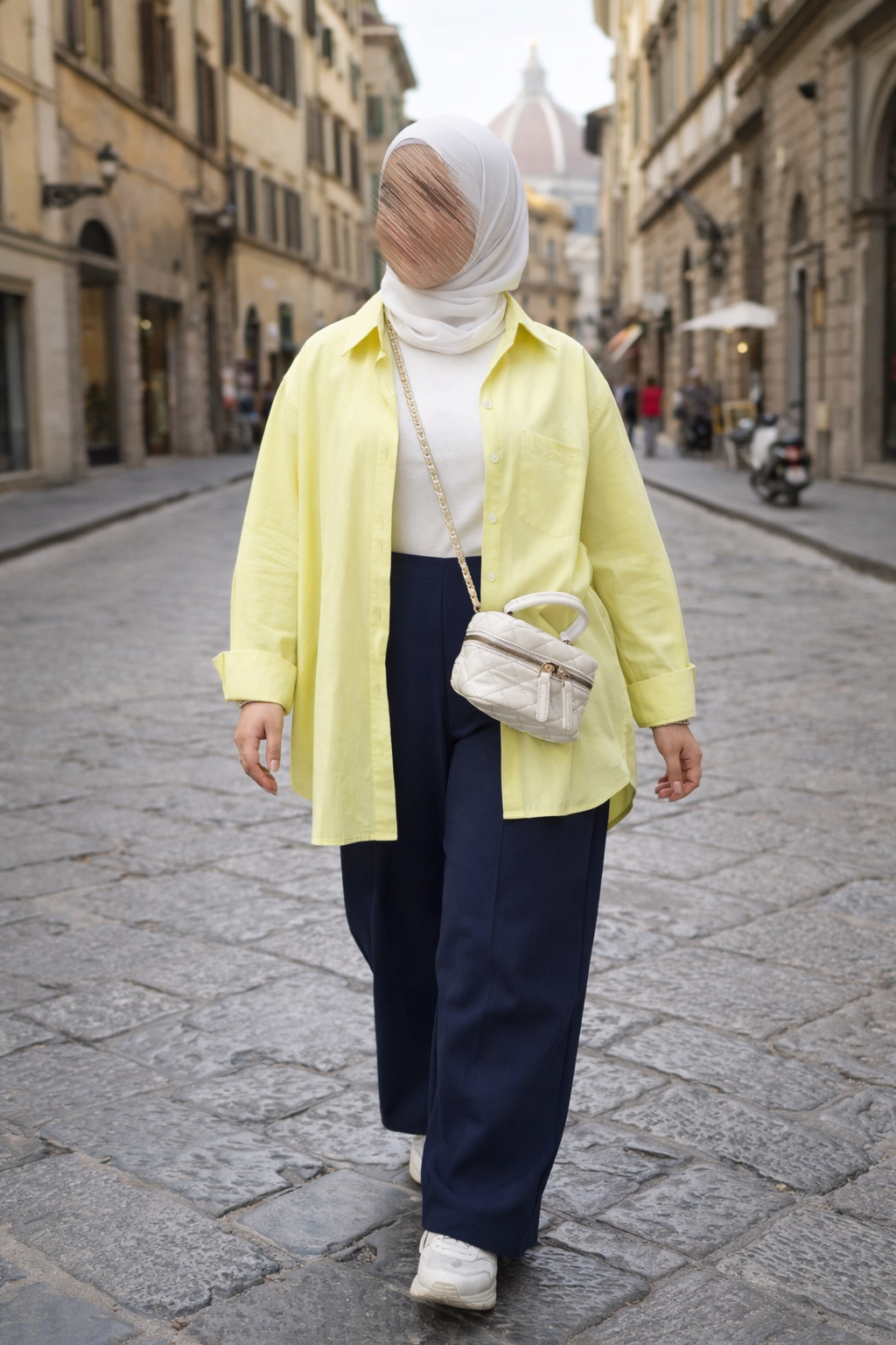 طقم صيفي أنيق يتكوّن من قميص أصفر ناعم مع توب داخلي وبنطلون واسع بقصة انسيابية مريحة.تنسيق هادئ ومشرق يضيف لمسة فخامة ناعمة لإطلالات السفر اليومية.