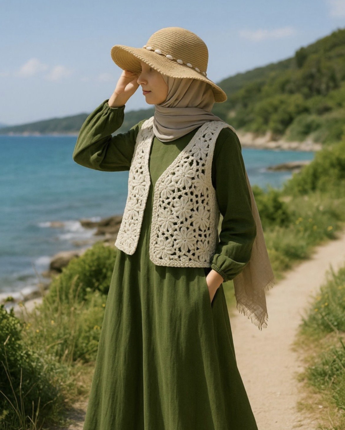 يتكوّن الطقم من فستان أخضر انسيابي مريح، قميص صوفي مخرّم بدون أكمام باللون البيج يضيف لمسة أنيقة، مع قبعة صيفية تكمل الإطلالة بأسلوب طبيعي وناعم.