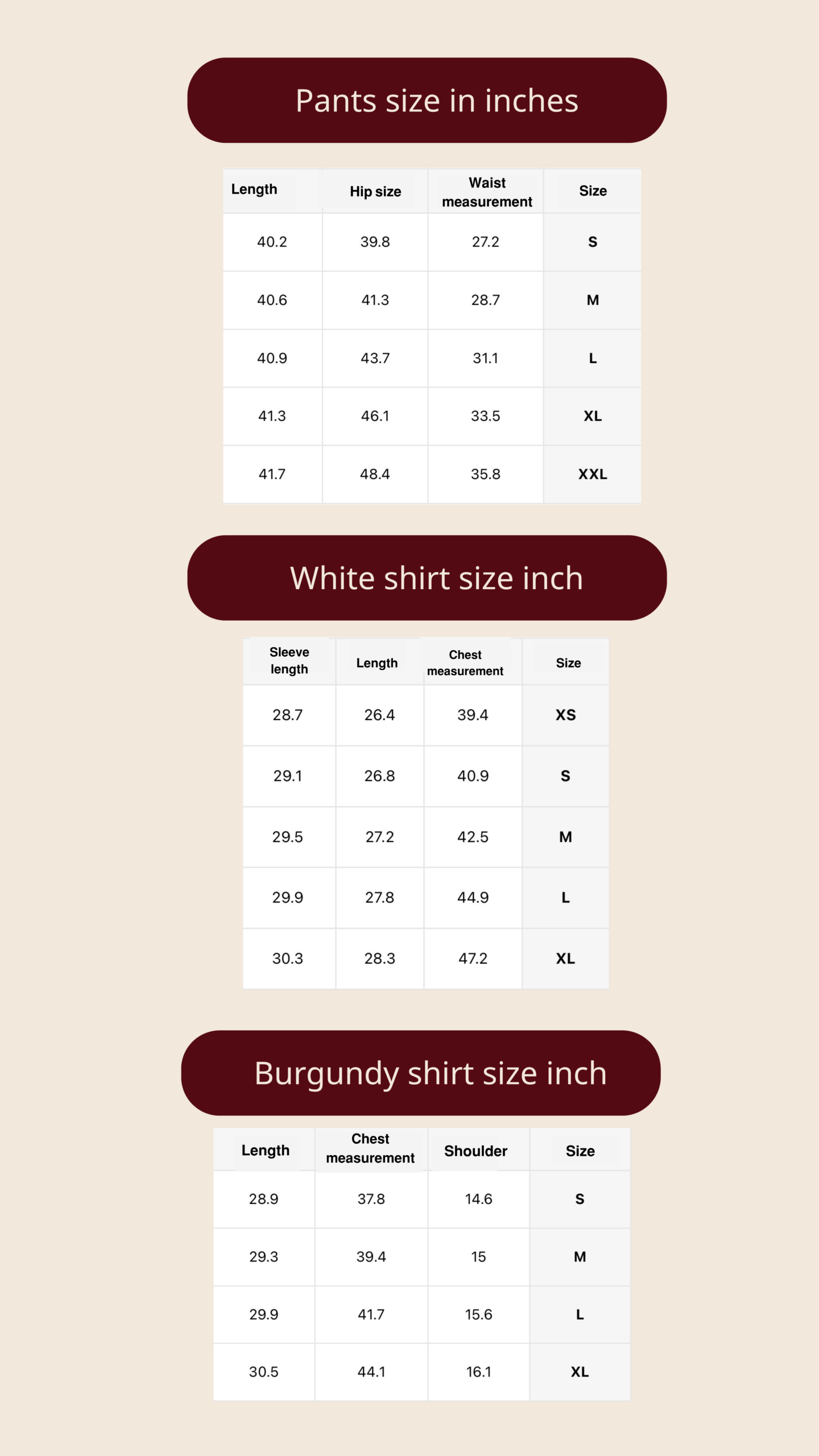 يتكوّن الطقم من بنطلون بقصّة مستقيمة، قميص أبيض أنيق، قميص عنابي بدون أكمام بتصميم عصري، مع حزام يحدد الخصر ويكمل الإطلالة بأسلوب متناسق.